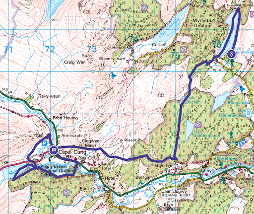 Swim to the end of the first part of Llyn Mymbyr and then get out on a small beach. Bushwhack about 40 meters up to the path which takes you back along the lake then follow the forestry paths back to the A5 just by the Siabod Café should you want cake! Walk along the pavement for the short distance along the A5 and back to your car.